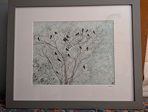 depicts a peaceful scene of crows roosting in early winter. Reproduced from the original ink-and-watercolor artwork using high-quality archival ink to give the images sharp clarity, with a smooth matte finish. Matted and framed, approximately 22” high by 18” wide. Signed and donated by the Maine-based artist, Mattie Rose Templeton.
