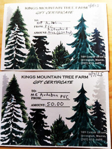 Two certificates, one for a Kings Mountain standard-size tree (under 8 feet high) and the other for merchandise in their retail store, including wreaths, kissing balls, and Maine-produced foods and craft items. Located at 789 Center Drive in Orrington.